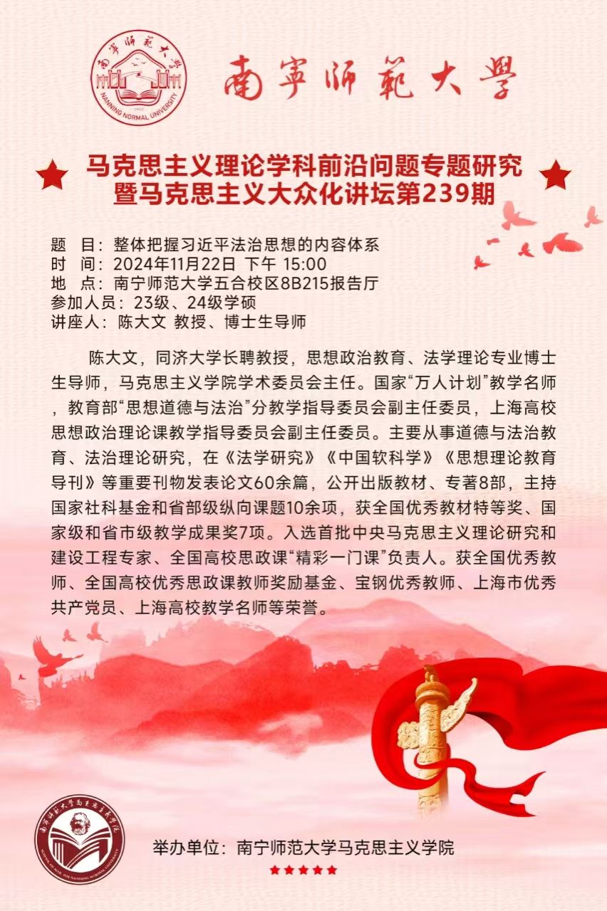 【讲座预告】马克思主义理论学科前沿问题专题研究暨马克思主义大众化讲坛第239期
