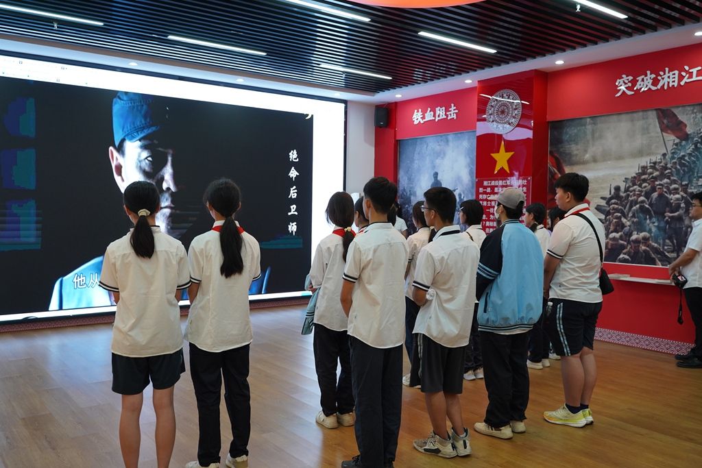 在学院学生宣讲团成员的引导下,学生们分组有序参观,以25幅油画作品为载体,展示中共一大上海会址、八一南昌起义、开国大典等经典场景的党史国史育人画廊。随后,大家来到“湘江战役虚拟仿真实验中心”,借助AR眼镜辅助教学的现代化应用模式,沉浸式体验湘江战役的激烈场景,仿佛置身于战火纷飞的年代,深刻感受到革命先辈们英勇无畏的牺牲精神,这极大地激发了青少年对马克思主义中国化进程的浓厚兴趣。