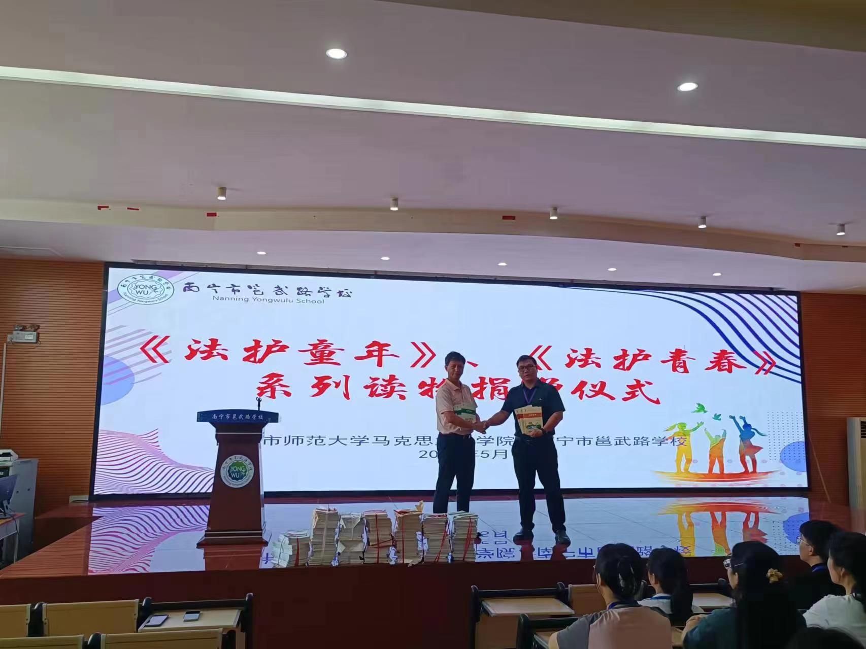 向邕武路学校捐赠《法护青春(上下册)》150套、《法护童年(上中下册)》150套和《遇事用法:身边法治案例》100册,三套书共400套(册)。随后,双方就共建义务教育学段思政课一体化建设实验学校暨中小学法治教育一体化国家级教学成果推广进行了深入的研讨和交流。双方还就小黄书