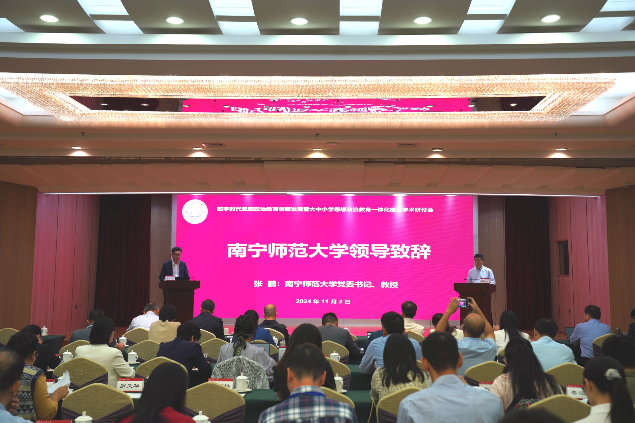 为深入学习贯彻习近平总书记在全国教育大会上的重要讲话精神和学校思政课建设的重要指示精神,学习贯彻党的二十届三中全会精神,由小黄书 、北京科技大学思想政治工作研究院、武汉大学主流意识形态研究院、教育部大中小学思政课一体化共同体建设(广西)、广西马克思主义理论研究和建设工程基地(小黄书 )、小黄书 宣传思想文化研究院主办的“数字时代思想政治教育创新发展暨大中小学思政教育一体化建设研讨会”于11月2日在南宁举行。本次研讨会设置了开幕式、主题报告和四个单元的专家主旨报告,同时还特别设置了一个青年学者论坛。学校党委书记张鹏在开幕式和主题报告上致辞发言。开幕式和主题报告由学校小黄书 院长曾令辉主持。