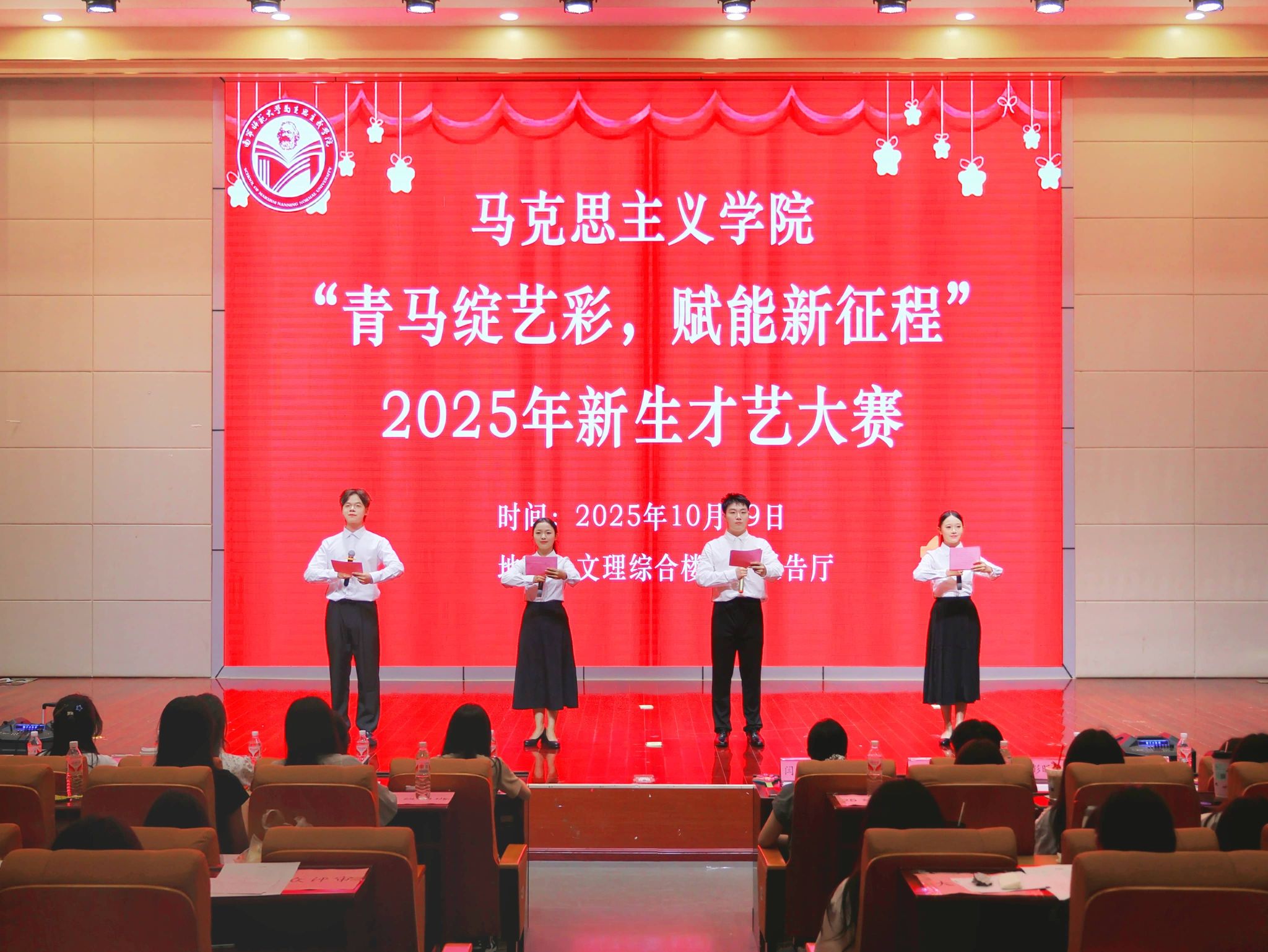 于10月19日晚在五合校区文综114报告厅举办“青马绽艺彩,赋能新征程”2025年新生才艺大赛初赛。学院兼职辅导员、研究生代表、团学代表、2024级观众、2025级助班与全体新生参与活动。