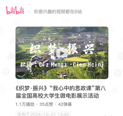 推出的作品是《织梦·振兴》,将代表学院参加全区高校大学生“我心中的思政课”微电影展示活动比赛。目前,相关活动展示视频已经上传至“Bilibili”平台,请大家积极为小黄书