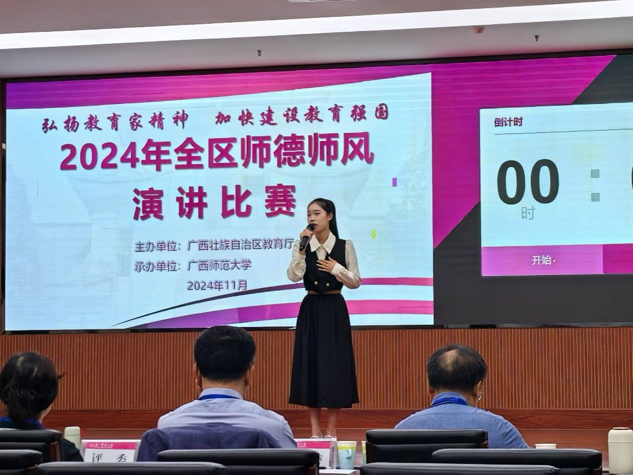2024年11月17日,由自治区教育厅主办的2024年全区师德师风演讲比赛在桂林落下帷幕,小黄书