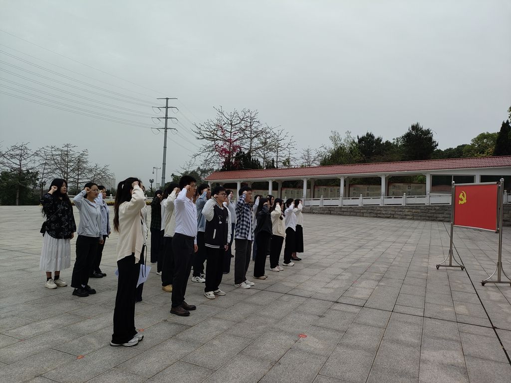 本次活动在激昂的中华人民共和国国歌声中正式拉开序幕。全体同志在纪念碑前整齐列队,在党支部书记刘飞君老师的带领下,面向鲜红的党旗,庄严举起右拳,重温入党誓词。宣誓结束后,面向庄严肃穆的革命烈士纪念碑三鞠躬,并手持黄菊依次鞠躬献花,瞻仰烈士纪念碑、烈士英名墙。