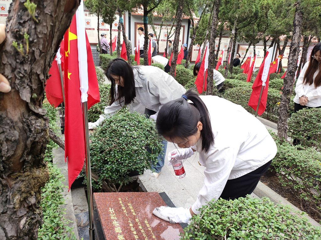 随后,同志们走进了英烈苑,手持白毛巾,仔细地擦拭每一座英雄烈士的墓碑。面对着一座座雄伟的烈士墓,同志们献上朵朵鲜花,并深深鞠躬以表达对英烈们永恒的缅怀与敬仰。活动接近尾声时,党员同志们纷纷表示,通过本次活动进一步理解了如今和平盛世的来之不易,将时刻牢记自己的党员身份和职责,把对革命先烈的敬仰之情转化为学习、工作的动力,为全面建设社会主义现代化国家贡献更多的力量。最后,党支部书记对本次活动进行了总结,并号召全体同学追忆八桂烽火,传承精神丰碑,践行青春誓言,勇担强国使命,要敢于迎难而上,克服困难。