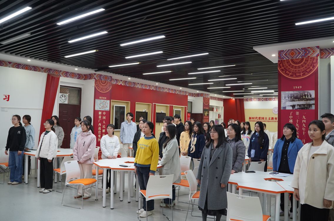 于12月4日上午在五合校区8栋B座209教室组织师生参加2025年教育系统“宪法晨读”活动。学院党委书记李玲、团委书记韦旖扬及师生代表们共同参与活动,沉浸式感受宪法精神。