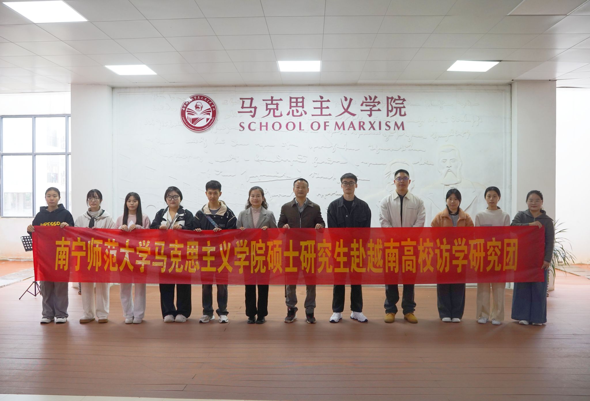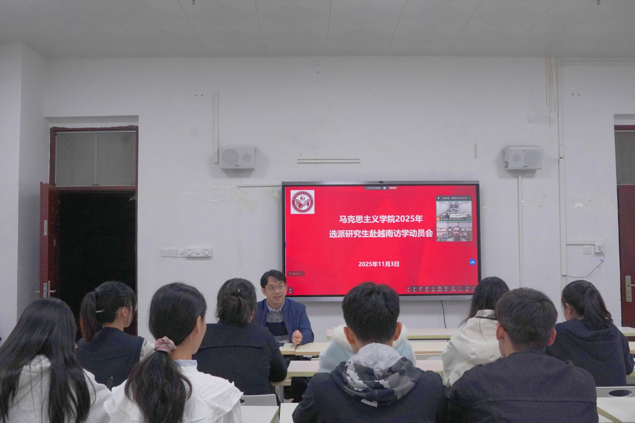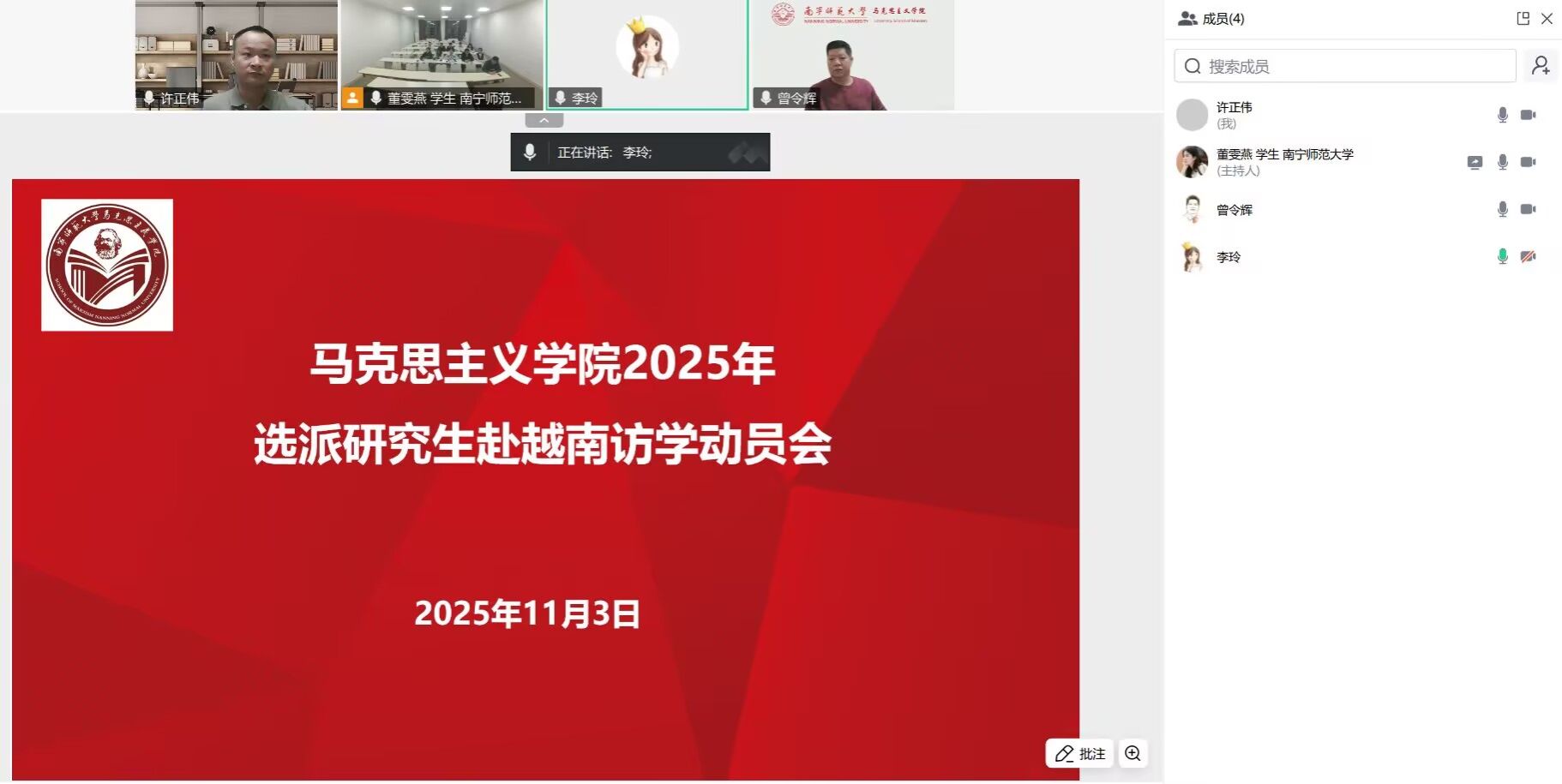小黄书 于11月3日晚召开2025年选派研究生赴越南访学动员会,李玲书记、曾令辉院长、许正伟博士、唐英毅为选派的研究生作临行前的注意事项提醒,本次动员会由邱尹副院长主持。