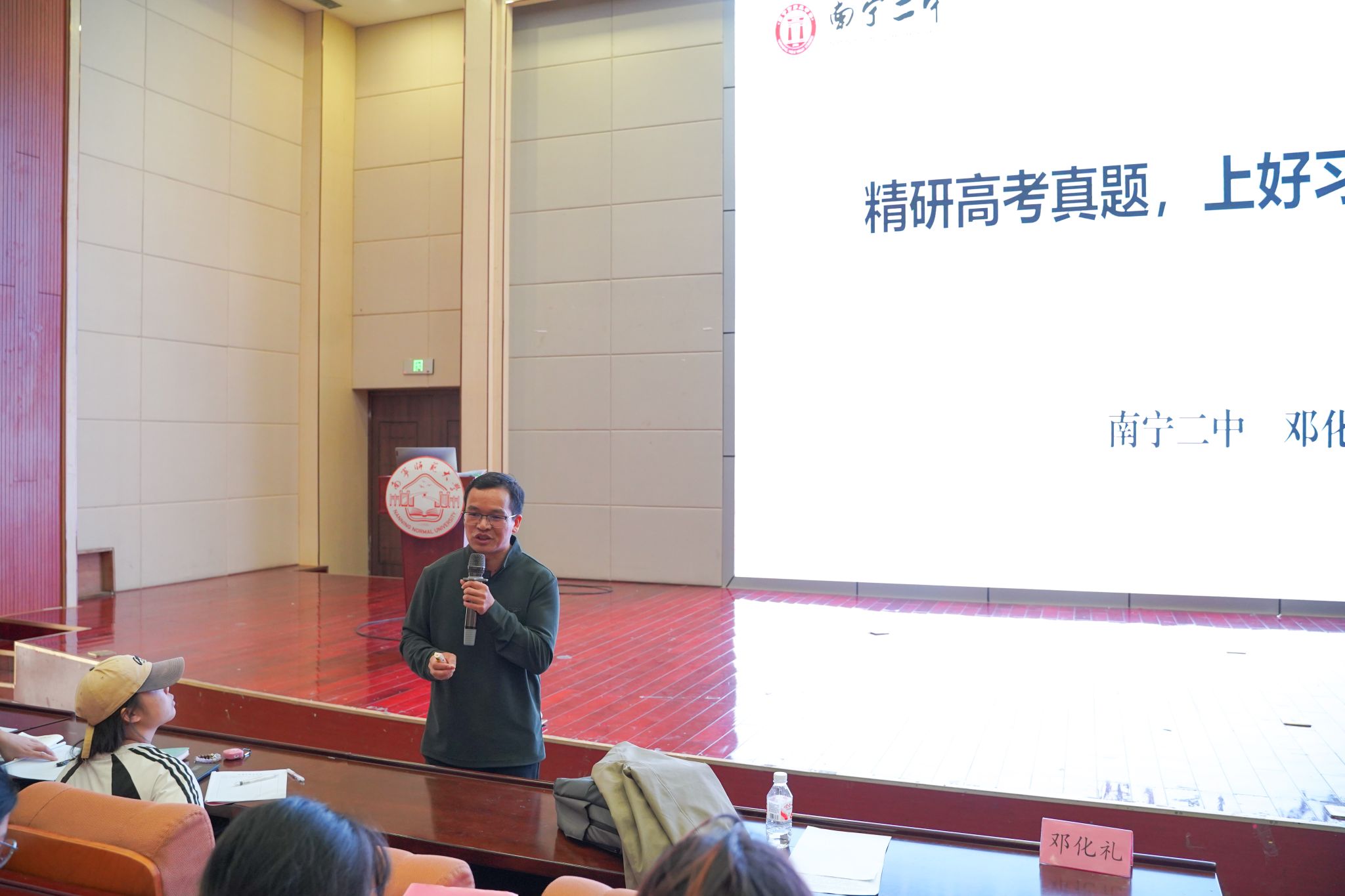 为提升学科教学(思政)专业硕士研究生及思想政治教育专业本科生教学技能,促进高校师范生培养与中学实际教学需求有效衔接,做好实习前教学准备。11月25日下午,小黄书 特邀南宁二中思政课教师邓化礼,在五合校区文综114报告厅作题为“名师示范:中学思政课讲评的智慧与艺术”专题讲座。讲座由温向莉教授主持,学院副院长邱尹、教学法教研室教师及相关专业学生共同参与。